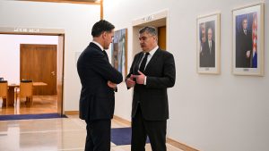 Potom se Mark Rutte zaputio u Banske dvore gdje ga je ponovno dočekao premijer Plenković – ovoga puta su razgovarali o vodećim sigurnosnim izazovima, jačanju europske obrane i modernizaciji OS RH. Nakon sastanka u Banskim dvorima, u izjavi za medije, predsjednik Vlade Andrej Plenković istaknuo je da posjet glavnog tajnika NATO-a dolazi u zahtjevnim sigurnosnim okolnostima za Europu i svijet, situaciji globalne nesigurnosti koja zahtijeva punu pažnju, uključenost i pripravnost. Na sastanku ga je, tvrdi premijer, upoznao s brojnim aktivnostima hrvatske Vlade u pogledu ispunjavanja preuzetih obveza u proteklim godinama, prije svega obveza izdvajanja dva posto BDP-a za obranu. U tom je kontekstu naglasio da je Hrvatska, u proračunskom smislu, 2025. godinu završila s 2,08 posto izdvajanja za obranu, ukupno milijardu i 931 milijun eura, dok je proračun Ministarstva obrane bio nešto veći od 1,5 milijardi eura. Što se tiče postotka tih sredstava koji se odnosi na modernizaciju, on je iznosio gotovo 34 posto. “Te su aktivnosti upotpunjene kupnjom modernih tehnologija, poput samohodnih haubica Caesar te borbenih tenkova Leopard.” Hrvatska za obranu koristi i nove instrumente Europske unije, dodao je Plenković, poput instrumenta SAFE iz kojeg joj je na raspolaganju 1,7 milijardi eura zajma.