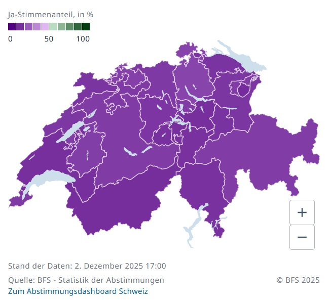 Sam referendum na čitavu tu temu bio je održan 30. studenog 2025. godine, i završio je prema prethodnim očekivanjima ustanovljenim u ispitivanjima javnoga mnijenja širom Švicarske (od 64 do 70 posto ispitanika je bilo “Protiv”). Naime, od ukupno oko 5,58 milijuna birača, na njega je izašlo oko 42,94 posto birača (njih 2.394.233) – od čega ih je 84,15 posto (birača 2.014.638) glasovalo “Protiv”, a 15,85 posto (379.595) glasovalo “Za”. Time je referendumski zahtjev bio odbijen, iako i neovisno od čitave te priče i nadalje ostaje na snazi parlamentarni zahtjev prema Bundesratu, da Vlada osmisli reformske korake.