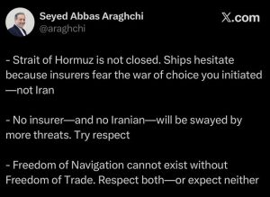 Za to vrijeme ni Iran ne spava, te se bilježio intervju iranskog ministra vanjskih poslova Abbasa Araghchija za američku televizijsku kuću MS NOW u subotu, 14. ožujka – koji je tom prilikom naznačio da Hormuz uopće nije zatvoren, budući da njime mogu prolaziti brodovi država koje nisu neprijatelji Irana, dok se zapravo zatvara prolaz samo za plovila neprijatelja (onih koji napadaju, SAD-a i Izraela, ili su im saveznici). Ove su izjave otvorile prostor za parcijalne dogovore pojedinih država direktno s Iranom – da bi se idućih dana krenulo bilježiti i pojačani prolaz kroz tjesnac indijskih i kineskih brodova. Do utorka, 17. ožujka, bilježilo se i promjenu ruta takvih plovila (uglavnom na izlazu iz Perzijskog zaljeva), što je onda 18. ožujka bilo potvrđeno i od strane ugledne publikacije Lloyd‘s List. Naime, za taj dogovoreni prolaz više se ne koriste tamošnji standardni prometni koridori, već plovila dolaze bliže iranskoj obali, navodno se prijavljuju radiovezom, zatim prilaze bliže između iranskih otoka Kešm i Larak, da bi onda kroz iranske teritorijalne vode nastavili put prema Omanskom zaljevu i otvorenom oceanu. Time je zapravo potvrđena operativna kontrola Irana nad Hormuškim tjesnacem, a barem dijelom je otvoren i tamošnji prolaz te izvoz energenata (posebno iranskih) – ali sve na način koji malo znači za brojna u Zaljevu nagomilana međunarodna plovila iz zemalja bez posebno dobrih bilateralnih odnosa s Iranom (od toga oko 220 raznih tankera i 18 LNG-brodova).