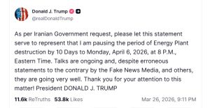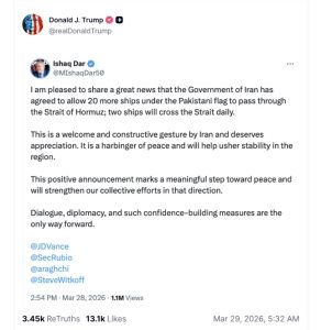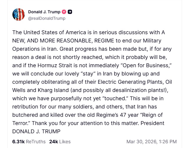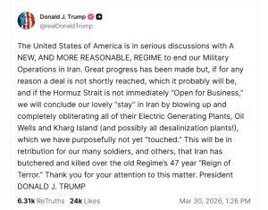 Valjda suočen s daljnjim rastom cijena nafte i ustrajnim nastavkom blokade Hormuza, oko 7:30 ujutro po američkom istočnom vremenu u ponedjeljak, 30. ožujka, opet je osvanula objava Trumpa na njegovoj društvenoj mreži Truth Social – u kojoj on prvo govori o nastavku pregovora (koje sada vodi s “NOVIM, I VIŠE RAZUMNIM, REŽIMOM”). No usprkos “sjajnom napretku“, ako “iz bilo kojeg razloga uskoro ne bude sporazuma, a vjerojatno će biti” – i ako “Hormuški tjesnac ne bude momentalno ‘otvoren za poslovanje’ – mi ćemo okončati naš predivni ‘boravak’ u Iranu uz razaranje, kompletno brisanje svih njihovih elektrana, izvora nafte i otoka Harg (a moguće i svih desalinizacijskih pogona!), koje namjerno do sada još nismo ‘dirali’“. Dakle, opet se tu pojačano prijeti masivnim uništavanjima iranske civilne infrastrukture (što je ratni zločin), ali ovoga puta bez izričitog navoda rokova (valjda do iza Uskrsa), i to ne samo radi (1) navodnih pregovora nego i (2) vezano uz hitno otvaranje Hormuškog tjesnaca – iako je, prema nekim medijima, itekako upitna njegova volja za provedbom duže operacije otvaranja ovog međunarodnog plovnog puta.