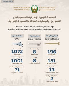 No ipak, lako je uočiti činjenicu da su spomenute rakete glavna meta svekolikih proturaketnih i protuzračnih sustava u regiji, tako da ih većina ipak završi srušena u dolasku (uz pojedine spektakularne izuzetke koji se probiju do ciljeva) – za razliku od toga, iako se čuje i o obaranju velikog broja lansiranih iranskih kamikaza-dronova, ipak izgleda kao da je većina medijski široko prenesenih šteta zapravo nastala baš njihovim djelovanjem širom Bliskog istoka. Posebno se tu često citiraju dnevni pregledi stanja iz Ujedinjenih Arapskih Emirata koji su pod posebno žestokim napadima, a dnevno objavljuju i pregledna izvješća o djelovanju svoje protuzračne obrane. Tako se ondje do ponedjeljka 2. ožujka brojilo 689 dronova (645 presretnuto, a 44 pogodila), 174 balističke rakete (161 srušena, 13 pogodilo) i 8 krstarećih raketa (sve presretnute). U utorak 3. ožujka došlo se do 812 dronova (755 presretnuto, 57 pogodilo), te 186 balističkih raketa (172 presretnute, 13 udarilo u more, 1 udarila u kopno) – da bi srijeda 4. ožujka brojila 941 dron (od toga 876 presretnuto, 65 pogodilo) i još 189 balističkih raketa (175 presretnuto, 13 udarilo u more i 1 udarila u kopno), a četvrtak 5. ožujka 1.072 drona (1.001 presretnut, 71 pogodio) te 196 balističkih raketa (181 presretnuta, 13 udarilo u more i 2 udarile u kopno). Dakle, usprkos velikom naporu tamošnjih protuzračnih snaga, ponekad pomognutih i od raznih zapadnih država – raketnu opasnost donekle se drži pod kontrolom, dok kamikaza-dronovi troše iznimno mnogo presretača, uz primjetno lošiji ukupni učinak spomenutih „zaštitnih kišobrana“. Da ne spomenemo da je i ekonomska logika ovih djelovanja ipak bitno usporedivija po pitanju balističkih projektila (koji su skuplji, pa ponešto bliže cijenama raketa presretača), dok se po pitanju iranskih kamikaza-dronova učestalo spominju navodi da takve letjelice u proizvodnji koštaju negdje između 10 i 50 tisuća USD, dok za njihovo rušenje korišteni presretači koštaju neusporedivo više (spominje se oko 4 milijuna USD za raketu PAC-3 MSE za Patriot, oko 15,5 milijuna USD po raketi sustava THAAD ili oko 1 milijun USD za rakete sustava RIM-116, a i praktično sva druga raketna protuzračna oružja vidljivo su skuplja, čak i laki mobilni sustavi kao STINGER – oko 480.000 USD ili Mistral 3 – oko 500.000 USD po komadu).
