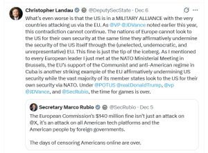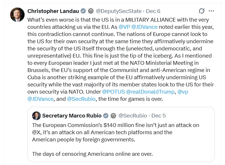 To više nije zajedničko dijeljenje tereta, već prebacivanje tereta na saveznike (Washington neće povećati obrambene izdatke). O tome govori i vijest koju je u petak objavio Reuters, kako Pentagon očekuje da će do 2027. godine europske članice NATO-a morati najveći dio konvencionalne obrane Europe. Ako to ne urade, SAD će prestati sudjelovati u radu dijela mehanizama obrambenog planiranja u Savezu. U subotu 6. prosinca je zamjenik američkog ministra vanjskih poslova Christopher Landau zaprijetio europskim saveznicima prekidom sigurnosnih jamstava SAD ako se nastave mjere protiv američkih kompanija (kazna od 120 milijuna USD društvenoj mreži X). Nešto ranije Landau je kritizirao europske saveznike zbog ograničavanja pristupa američkim proizvođačima europskim programima razvoja oružanih sustava.